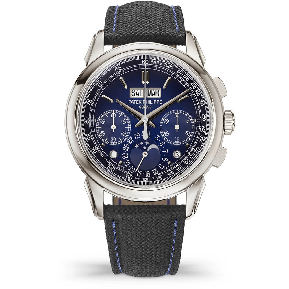 外周に向かって濃くなるブラック・グラデーションのラック・ブルー、ホワイトゴールド・ファセット仕上げ《オビュ》(弾丸)型植字アワーマーカー、タキメーター目盛 ホワイトゴールド・ファセット仕上げドフィーヌ型時・分針